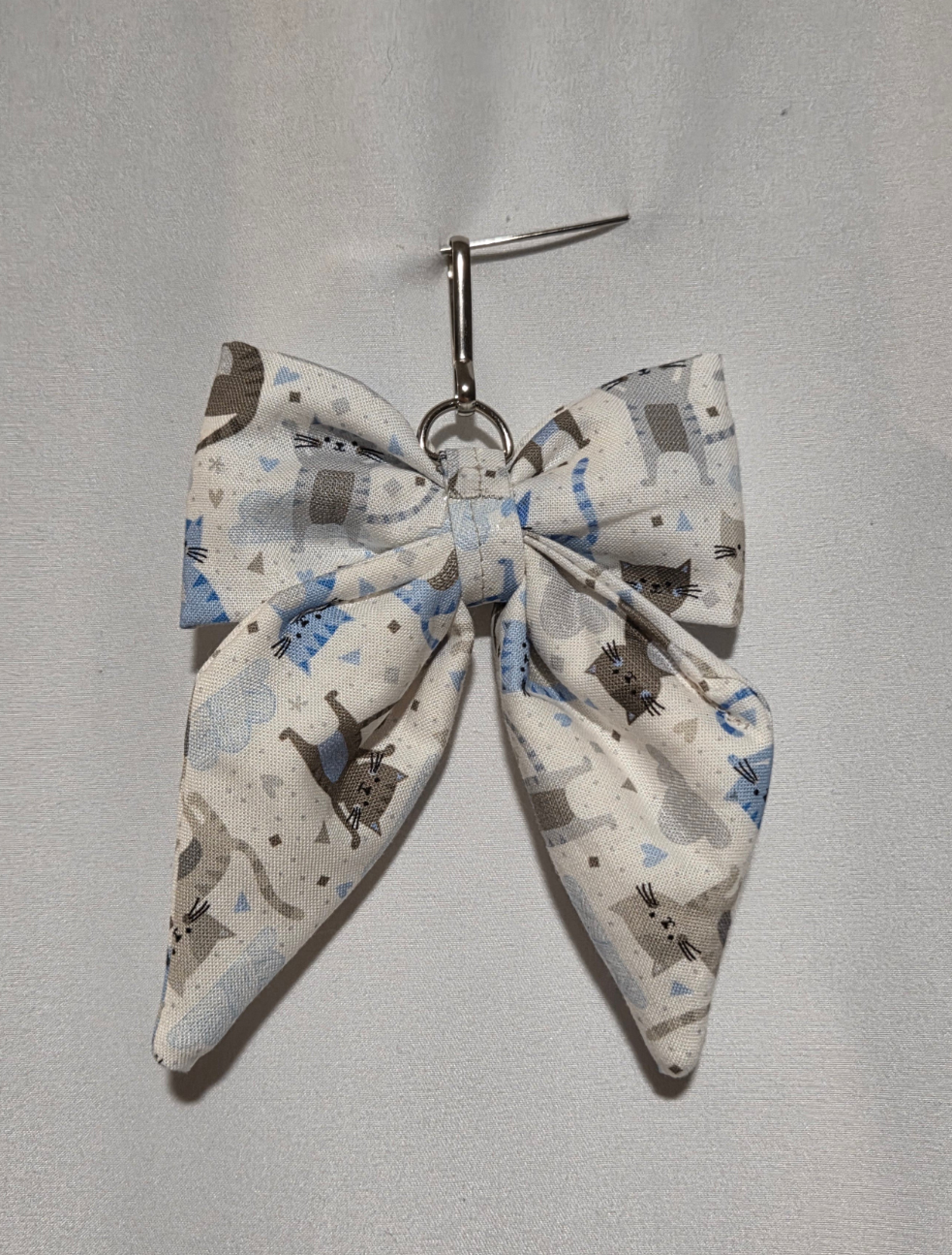 Bow key chains about 4in by 4in blue and white cat